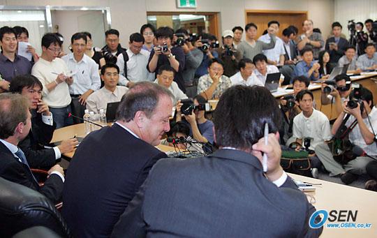 아드보카트 신임 국가대표팀 감독이 30일 오전 서울 신문로 축구회관에서 가진 취임 기자회견에 많은 보도진이 몰린 가운데 아드보카트 감독이 통역(오른쪽)을 통해 질문 내용을 전해 듣고 있다./주지영 기자 jj0jj0@osen.co.kr [Copyright ⓒ OSEN(www.osen.co.kr) 무단전재 및 재배포 금지]