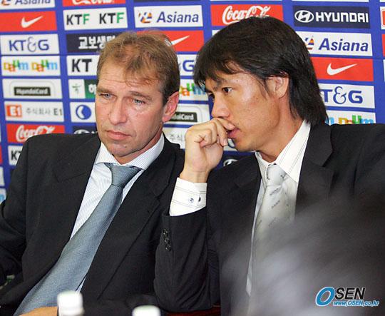 30일 오전 서울 신문로 축구회관에서 가진 아드보카트 신임 국가대표팀 감독 취임 기자회견 도중 홍명보 코치가 베어벡 수석 코치와 귓속말을 나누고 있다./주지영 기자 jj0jj0@osen.co.kr [Copyright ⓒ OSEN(www.osen.co.kr) 무단전재 및 재배포 금지]