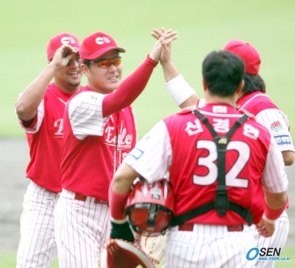 1일 문학구장에서 벌어진 SK 와이번스와 한화 이글스의 준PO 1차전은 한화의 4-1 완승으로 끝났다. 한화는 문동환의 완투와 조원우의 홈런 포함 4타수 4안타의 맹활약으로 손쉬운 승리를 거두었다. 완투승을 올린 문동환이 마운드에서 동료들의 축하를 받고 있다./인천=손용호 기자 spjj@osen.co.kr [Copyright ⓒ OSEN(www.osen.co.kr) 무단전재 및 재배포 금지]