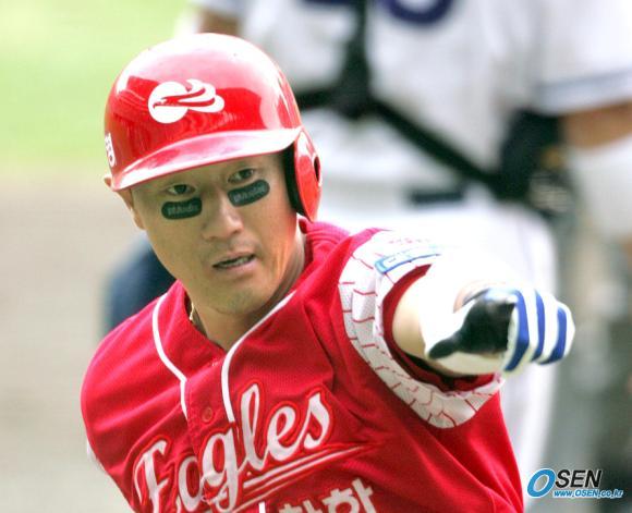 1일 문학구장에서 벌어진 SK 와이번스와 한화 이글스의 준PO 1차전은 한화의 4-1의 완승으로 끝났다. 한화는 문동환의 완투와 조원우의 홈런 포함 4타수 4안타의 맹활약으로 손쉬운 승리를 거두었다. 9회초 선두 타자로 나와 승부에 쐐기를 박는 좌월 솔로 홈런을 친 조원우가 세리머니를 벌이고 있다./인천=손용호 기자spjj@osen.co.kr [Copyright ⓒ OSEN(www.osen.co.kr) 무단전재 및 재배포 금지]