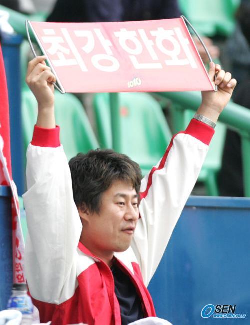 1일 문학구장에서 벌어진 SK 와이번스와 한화 이글스의 준PO 1차전은 한화의 4-1 완승으로 끝났다. 한화의 홍보 대사인 인기 개그맨 남희석이 9회초 조원우의 쐐기 홈런이 나오자 '최강 한화'이라고 적힌 소형 플래카드를 번쩍 들어올리고 있다./인천=손용호 기자 spjj@osen.co.kr [Copyright ⓒ OSEN(www.osen.co.kr) 무단전재 및 재배포 금지]