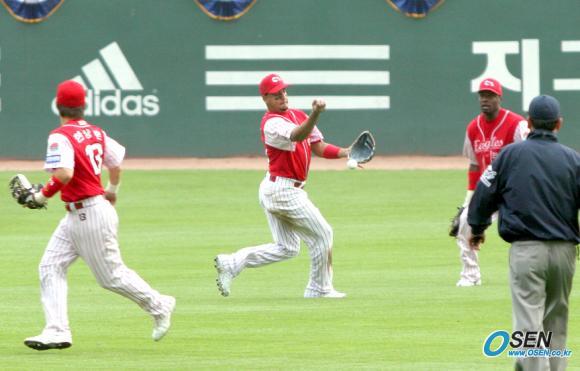 1일 문학구장에서 벌어진 SK 와이번스와 한화 이글스의 준PO 1차전은 한화의 4-1 완승으로 끝났다. 한화는 문동환의 완투와 조원우의 홈런 포함 4타수 4안타로 손쉬운 승리를 거두었다. 8회말 SK 김기태의 높은 플라이볼을 한화 유격수 브리또가 놓치고 있다./인천=손용호 기자 spjj@osen.co.kr [Copyright ⓒ OSEN(www.osen.co.kr) 무단전재 및 재배포 금지]
