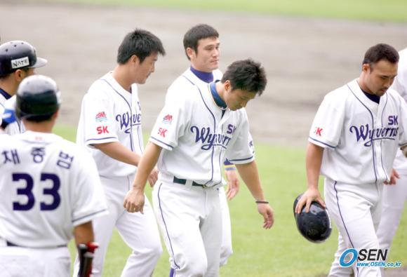 1일 문학구장에서 벌어진 SK 와이번스와 한화 이글스의 준PO 1차전은 한화의 4-1 완승으로 끝났다. 한화는 문동환의 완투와 조원우의 홈런 포함 4타수 4안타로 손쉬운 승리를 거두었다. SK 선수들이 경기 후 침울한 표정으로 팬들에게 인사하고 있다./인천=손용호 기자 spjj@osen.co.kr [Copyright ⓒ OSEN(www.osen.co.kr) 무단전재 및 재배포 금지]