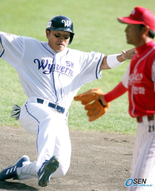 2일 문학구장에서 벌어진 SK 와이번스와 한화 이글스의 준PO 2차전 SK의 4회말 1사 1,2루서 김태균의 3유간 깊은 타구를 잡은 한화 유격수 브리또가 3루에 악송구하자 2루 주자 채종범이 홈까지 파고 들어 3-2로 역전시키고 있다./인천=손용호 기자 spjj@osen.co.kr [Copyright ⓒ OSEN(www.osen.co.kr) 무단전재 및 재배포 금지]