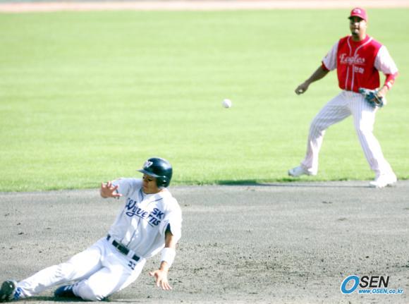 2일 문학구장에서 벌어진 SK 와이번스와 한화 이글스의 준PO 2차전 SK의 4회말 1사 1,2루서 김태균의 3유간 깊숙한 타구를 잡은 한화 유격수 브리또가 3루에 송구한 뒤 쳐다보고 있다. 그러나 공은 3루수 이범호가 잡을 수 없는 쪽으로 날아와 2루주자 채종범이 홈까지 들어가 3-2로 역전됐다./인천=손용호 기자spjj@osen.co.kr [Copyright ⓒ OSEN(www.osen.co.kr) 무단전재 및 재배포 금지]