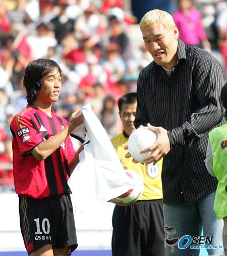 2일 서울 상암 월드컵경기장에서 벌어진 FC 서울과 인천 유나이티드의 경기 시축을 맡은 K-1 스타 최홍만이 박주영의 사인볼과 자신의 T셔츠를 교환하고 있다./상암=주지영 기자 jj0jj0@osen.co.kr [Copyright ⓒ OSEN(www.osen.co.kr) 무단전재 및 재배포 금지]
