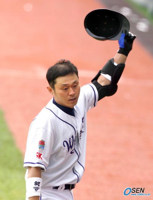 2일 문학구장에서 벌어진 SK 와이번스와 한화 이글스의 준PO 2차전 SK의 8회말 선두타자로 나온 박경완이 한화 구원투수 조성민으로부터 좌측 펜스를 넘어가는 솔로 홈런을 날린 뒤 헬멧을 벗어 팬들에게 인사하고 있다./인천=손용호 기자 spjj@osen.co.kr [Copyright ⓒ OSEN(www.osen.co.kr) 무단전재 및 재배포 금지]