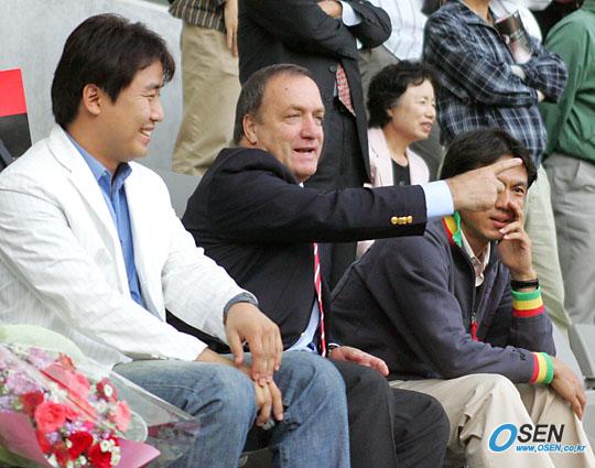 2일 서울 상암 월드컵경기장에서 벌어진 FC 서울과 인천 유나이티드의 경기를 관전하러 나온 아드보카트 신임 국가대표팀 감독이 통역 박일기 씨 및 홍명보 코치와 얘기하며 웃고 있다. /상암=주지영 기자 jj0jj0@osen.co.kr [Copyright ⓒ OSEN(www.osen.co.kr) 무단전재 및 재배포 금지]