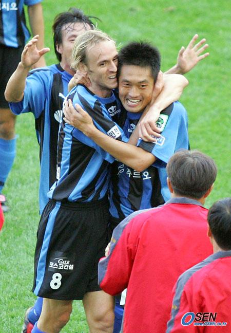 2일 서울 상암 월드컵경기장에서 벌어진 FC 서울과 인천 유나이티드의 경기 후반 21분 인천의 서동원(가운데)이 오른발 슛을 터뜨려 1-2로 역전당한 뒤 불과 2분만에 2-2 재동점을 만들고 아기치와 얼싸안으며 기뻐하고 있다. /상암=주지영 기자 jj0jj0@osen.co.kr [Copyright ⓒ OSEN(www.osen.co.kr) 무단전재 및 재배포 금지]