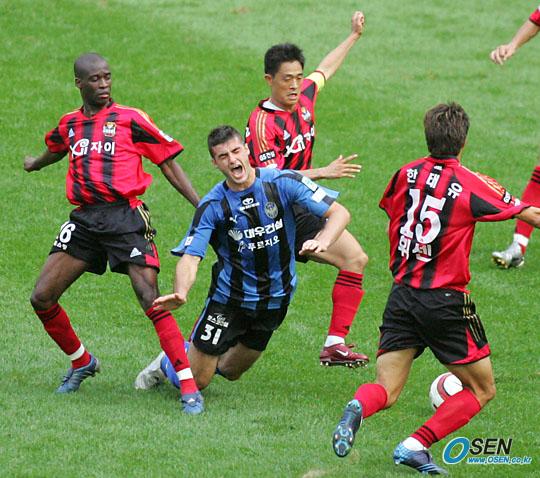 2일 서울 상암 월드컵경기장에서 벌어진 FC 서울과 인천 유나이티드의 경기 후반 인천의 라돈치치가 FC 서울 이민성 실바 한태유 사이에서 밀려 넘어지고 있다./상암=주지영 기자 jj0jj0@osen.co.kr [Copyright ⓒ OSEN(www.osen.co.kr) 무단전재 및 재배포 금지]