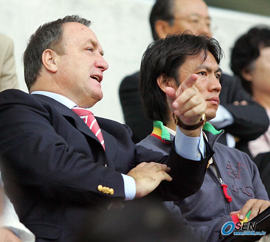 2일 상암 월드컵 경기장에서 벌어진 FC서울과 인천 유나이티드의 경기를 관전하기위해 통역관과 홍명보 코치와 함께 경기장을 찾은 아드보카트 감독이 홍명보 코치와 경기를 보며 얘기를 나누고 있다./상암=주지영 기자 jj0jj0@osen.co.kr [Copyright ⓒ OSEN(www.osen.co.kr) 무단전재 및 재배포 금지]