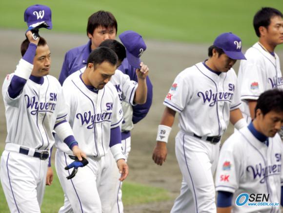 3일 문학구장에서 벌어진 SK 와이번스와 한화 이글스의 준PO 3차전서 한화가 SK에 5-3으로 역전승을 거두었다. 9회말 1사 1, 2루에서 박경완의 병살타로 역전에 실패한 SK 선수들이 팬들에게 인사를 하고 침울한 표정으로 그라운드를 빠져 나가고 있다. /인천=손용호 기자 spjj@osen.co.kr [Copyright ⓒ OSEN(www.osen.co.kr) 무단전재 및 재배포 금지]
