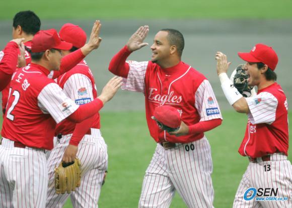 3일 문학구장에서 벌어진 SK 와이번스와 한화 이글스의 준PO 3차전은 한화가 SK에 5-3으로 역전승을 거두었다. 9회말 1사 1, 2루에서 박경완의 병살타로 경기를 마감한 한화의 브리또가 이날 결승타를 친 이도형의 환영을 받고 있다. /인천=손용호 기자 spjj@osen.co.kr [Copyright ⓒ OSEN(www.osen.co.kr) 무단전재 및 재배포 금지]