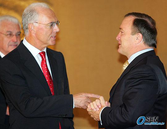 4일 저녁 서울 하얏트 호텔에서 열린 만찬에 앞서 프란츠 베켄바워 독일월드컵 조직위원장과 신임 대표팀 아드보카트 감독이 인사를 나누고 있다. 베켄바워는 2006 독일 월드컵 홍보차 본선 진출국들을 순회 방문하고 있다. /하얏트호텔=주지영 기자 jj0jj0@osen.co.kr [Copyright ⓒ OSEN(www.osen.co.kr) 무단전재 및 재배포 금지]