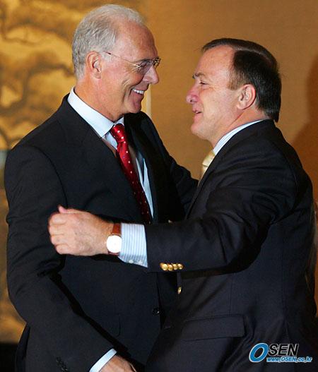 4일 저녁 서울 하얏트 호텔에서 열린 만찬에서 프란츠 베켄바워 독일월드컵 조직위원장과 아드보카트 대표팀 신임 감독이 반갑게 포옹하고 있다. 베켄바워는 2006 독일 월드컵 홍보차 본선 진출국들을 순회 방문하고 있다. /하얏트호텔=주지영 기자 jj0jj0@osen.co.kr