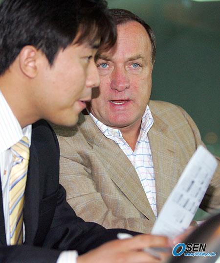 5일 성남 일화와 수원 삼성의 경기를 관전하기 위해 성남 제2종합운동장을 찾은 아드보카트 신임 국가대표팀 감독이 통역 박일기 씨와 함께 경기가 시작되기 전 선수들의 명단을 보며 이야기하고 있다./성남=주지영 기자 jj0jj0@osen.co.kr [Copyright ⓒ OSEN(www.osen.co.kr) 무단전재 및 재배포 금지]