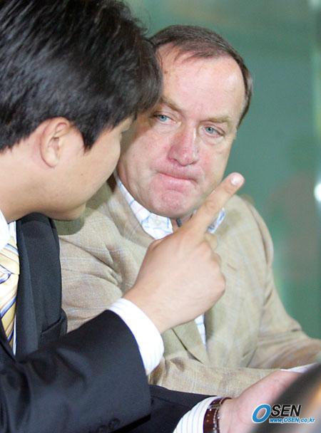아드보카트 신임 국가대표팀 감독이 5일 성남 일화와 수원 삼성의 경기를 관전하기 위해 성남 제2종합운동장에 나타나 경기 시작에 앞서 통역 박일기 씨의 설명을 진지한 표정으로 듣고 있다./성남=주지영 기자 jj0jj0@osen.co.kr [Copyright ⓒ OSEN(www.osen.co.kr) 무단전재 및 재배포 금지]