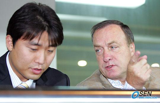 5일 성남 일화와 수원 삼성의 경기를 관전하기 위해 성남 제2종합운동장을 찾은 아드보카트 신임 국가대표팀 감독이 경기 개시 전 통역 박일기 씨와 함께 출전 선수 명단을 보면서 그라운드에서 몸을 풀고 있는 누군가를 가리키고 있다./성남=주지영 기자 jj0jj0@osen.co.kr [Copyright ⓒ OSEN(www.osen.co.kr) 무단전재 및 재배포 금지]