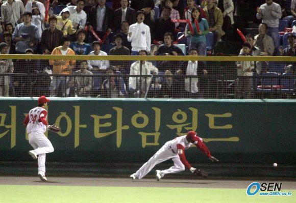 5일 대전구장에서 벌어진 한화 이글스와 SK 와이번스의 준PO 4차전 SK의 3회초 1사 후 김민재의 우중간 깊숙한 타구에 한화 중견수 데이비스가 글러브를 갖다 댄 뒤 우익수 고동진과 순간적으로 엇갈린 뒤 놓치며 넘어지고 있다. /대전=손용호 기자 spjj@osen.co.kr [Copyright ⓒ OSEN(www.osen.co.kr) 무단전재 및 재배포 금지]
