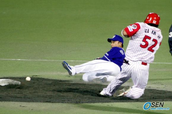 5일 대전구장에서 벌어진 한화 이글스와 SK 와이번스의 준PO 4차전 한화의 4회말 무사 1루서 타자 이도형에게 볼넷이 선언되는 순간 SK 포수 박경완이 2루로 뛴 1루주자 김태균을 잡으려고 했으나 악송구가 되며 볼이 뒤로 빠지고 있다./대전=손용호 기자 spjj@osen.co.kr [Copyright ⓒ OSEN(www.osen.co.kr) 무단전재 및 재배포 금지]