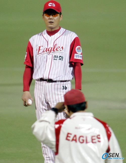5일 대전구장에서 벌어진 한화 이글스와 SK 와이번스의 준PO 4차전서 한화의 선발 투수 문동환이 6⅓이닝동안 4실점한 뒤 마운드를 윤근영에게 물려주었다. 7회초 1사 후 김민재에게 안타를 맞자 최일언 투수코치가 교체를 위해 마운드에 올라가고 있다. /대전=손용호 기자 spjj@osen.co.kr [Copyright ⓒ OSEN(www.osen.co.kr) 무단전재 및 재배포 금지]