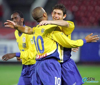 성남 일화가 '지역 라이벌' 수원 삼성을 제압하고 삼성 하우젠 2005 후기리그 우승을 향한 날개를 다시 폈다. 성남은 5일 성남 제2종합운동장에서 가진 수원과의 후기리그 홈경기에서 후반 5분 모따의 헤딩 결승골에 힘입어 1-0으로 승리했다. 지난 2일 경기에서 대구FC에 0-1로 지며 후기리그에서 첫 패전을 기록, 다소 상승세가 꺾였던 성남은 4승1무1패, 승점 13점째를 올렸다. 전반 초반 미드필드 지역에서의 치열한 볼다툼으로 한치도 물러서지 않는 양상으로 진행된 경기는 중반 들어서면서 성남이 미드필드 지역에서 주도권을 잡으며 김두현, 두두, 히카르도의 날카로운 공격이 이어졌으나 번번이 오프사이드 함정에 빠져 득점포를 터뜨리지 못했다. 오히려 전반 후반에는 수원 김대의의 빠른 발과 마토, 김동현의 헤딩 등으로 밀렸지만 성남의 탄탄한 수비로 실점을 막아냈다. 전반을 득점없이 마친 가운데 골은 후반 들어 순식간에 터졌다. 후반 5분 수원 진영 오른쪽 터치라인에서 김도훈이 올린 크로스가 골 지역으로 달려들던 모따의 머리에 정확히 적중했고 이 볼이 수원 골키퍼 이운재가 손 쓸 틈도 없이 골문 안으로 빨려들어갔다. 불의의 일격을 맞은 수원은 후반 12분 골잡이 산드로를 투입시켰지만 성남의 수비진을 끝내 뚫지 못했고 간간이 이어지는 성남의 역습에 고전하며 끝내 동점골을 넣지 못한채 무릎을 꿇었다. 한편 이날 경기에서는 딕 아드보카트 감독이 대표팀에 차출된 송종국, 김두현 등을 보기 위해 성남 제2종합운동장을 찾았으나 기자들의 인터뷰를 사양한 채 경기만 관전하고 돌아갔다. 성남=박상현 기자 tankpark@osen.co.kr 선제 결승골을 넣은 뒤 좋아하는 성남의 모따(오른쪽)와 두두 [Copyright ⓒ OSEN(www.osen.co.kr) 무단전재 및 재배포 금지]