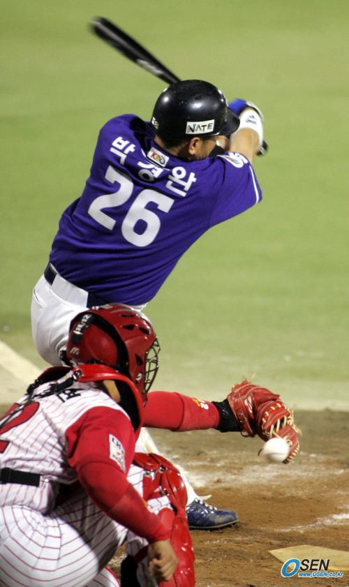 5일 대전구장에서 벌어진 한화 이글스와 SK 와이번스의 준PO 4차전 SK의 8회초 무사 만루서 한화 투수 윤규진이 박경완을 헛스윙 삼진으로 잡는 순간 포수 신경현이 공을 뒤로 빠트리고 있다. 이 사이 3루주자 김재현이 홈을 밟았다./대전=손용호 기자 spjj@osen.co.kr [Copyright ⓒ OSEN(www.osen.co.kr) 무단전재 및 재배포 금지]