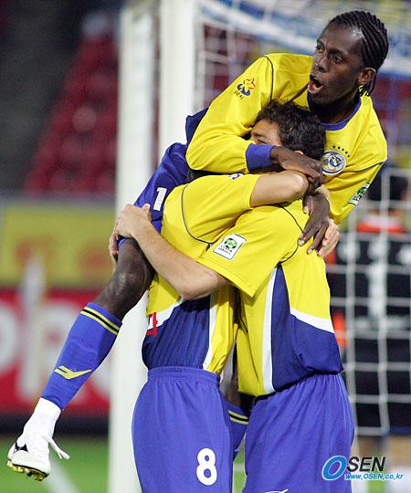 5일 성남 제2종합운동장에서 벌어진 성남 일화와 수원 삼성의 경기 후반 모따(오른쪽)가 선제골을 터뜨리자 히카르도(가운데)가 김두현과 모따의 몸 위로 올라타며 기뻐하고 있다./성남=주지영 기자 jj0jj0@osen.co.kr [Copyright ⓒ OSEN(www.osen.co.kr) 무단전재 및 재배포 금지]
