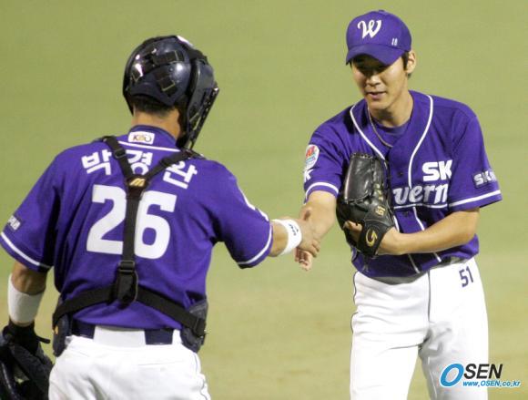 5일 대전구장에서 벌어진 한화 이글스와 SK 와이번스의 준PO 4차전서 SK가 한화에 6-1로 이겨 플레이오프 진출팀은 최종 5차전에서 가려지게 됐다. 마무리로 나온 윤길현이 경기 후 포수 박경완과 악수를 하고 있다./대전=손용호 기자 spjj@osen.co.kr [Copyright ⓒ OSEN(www.osen.co.kr) 무단전재 및 재배포 금지]