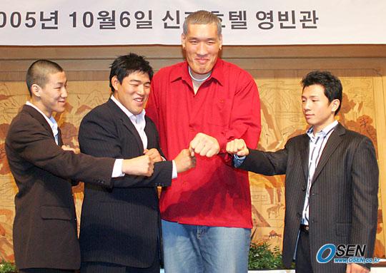 오는 11월 5일 서울 올림픽공원 체조경기장에서 잇달아 벌어질 코리아 맥스 2005 대회와 히어로스 대회 공동 기자회견이 6일 오후 서울 신라호텔 영빈관에서 열렸다. 주먹을 한데 모으며 기념 촬영할 때 김민수(왼쪽에서 두 번째)와 이날 기자회견에 특별 참석한 최홍만이 주먹 크기가 비교가 되자 서로 웃고 있다./주지영 기자 jj0jj0@osen.co.kr [Copyright ⓒ OSEN(www.osen.co.kr) 무단전재 및 재배포 금지]