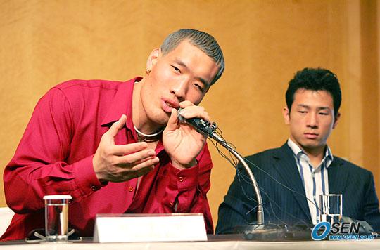 오는 11월 5일 서울 올림픽공원 체조경기장에서 잇달아 벌어질 코리아 맥스 2005 대회와 히어로스 대회 공동 기자회견이 6일 오후 서울 신라호텔 영빈관에서 열렸다. 이날 기자회견에 특별 참석한 최홍만이 손을 써가며 답변하고 있다. 오른쪽은 임치빈./=주지영 기자 jj0jj0@osen.co.kr [Copyright ⓒ OSEN(www.osen.co.kr) 무단전재 및 재배포 금지]