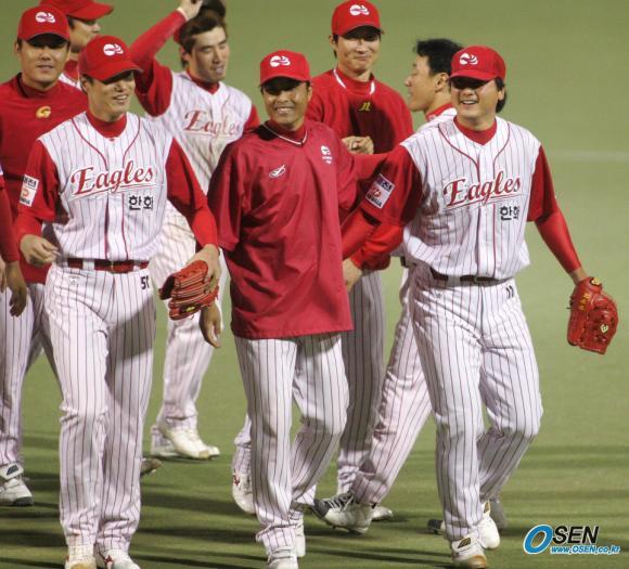 6일 대전구장에서 벌어진 준PO 5차전서 한화 이글스가 SK 와이번스에 6-5로 승리, 플레이오프에 진출했다. 포스트시즌 사상 최고령 선발승을 기록한 송진우(가운데)가 3이닝 세이브를 올린 최영필(오른쪽)의 등을 두드려 주고 있다./대전=손용호 기자 spjj@osen.co.kr [Copyright ⓒ OSEN(www.osen.co.kr) 무단전재 및 재배포 금지]