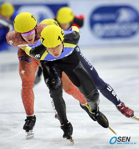 2005~2006 ISU쇼트트랙 서울 월드컵대회가 7일 오후 목동 종합운동장 실내 아이스링크에서 열렸다. 1500M 남자 준준결승에서 안현수가 1등, 캐나다의 하멜린이 2등, 오노가 3등으로 결승점을 지나고 있다./목동실내링크=주지영 기자 jj0jj0@osen.co.kr [Copyright ⓒ OSEN(www.osen.co.kr) 무단전재 및 재배포 금지]