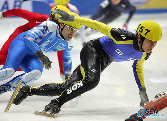 2005~2006 ISU쇼트트랙 서울 월드컵대회가 7일 오후 서울 목동 종합운동장 내 실내아이스링크에서 개막됐다. 1500M 남자 준결승서 안현수가 막판에 앞으로 치고 나가 결승에 진출, 우승을 차지했다./목동실내링크=주지영 기자 jj0jj0@osen.co.kr [Copyright ⓒ OSEN(www.osen.co.kr) 무단전재 및 재배포 금지]