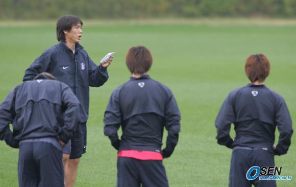 이란과의 평가전에 대비해 7일 오후 파주 NFC에 소집된 '아드보카트 1기' 태극전사들이 첫 훈련을 실시했다. 지도자로서 첫 발을 내딛은 홍명보 코치가 선수들에게 6대6 미니 연습경기를 치를 소속 조를 불러주고 있다./파주=손용호 기자 spjj@osen.co.kr [Copyright ⓒ OSEN(www.osen.co.kr) 무단전재 및 재배포 금지]