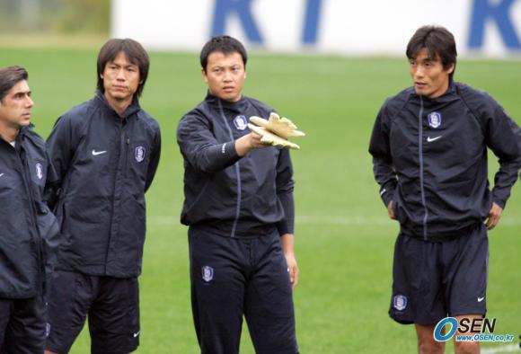 이란과의 평가전에 대비해 7일 오후 파주 NFC에 소집된 '아드보카트 1기' 태극전사들이 첫 훈련을 실시했다. 압신 코트비 보조코치, 홍명보 코치, 골키퍼 이운재, 최고참 수비수 최진철 등 2002년 한일월드컵 멤버들이 나란히 서서 대화를 나누고 있다./파주=손용호 기자 spjj@osen.co.kr [Copyright ⓒ OSEN(www.osen.co.kr) 무단전재 및 재배포 금지]