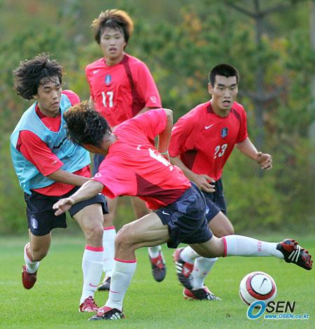 아드보카트 신임 감독이 이끄는 한국 축구대표팀이 소집 이틀째인 8일 오전에 이어 오후에도 훈련을 소화했다. 오후 훈련서 실시한 연습게임 도중 박주영(왼쪽)이 상대 수비수 김영철 옆으로 공을 빼자 뒤에서 이호와 조원희(오른쪽)가 달려오고 있다./파주=주지영 기자 jj0jj0@osen.co.kr [Copyright ⓒ OSEN(www.osen.co.kr) 무단전재 및 재배포 금지]