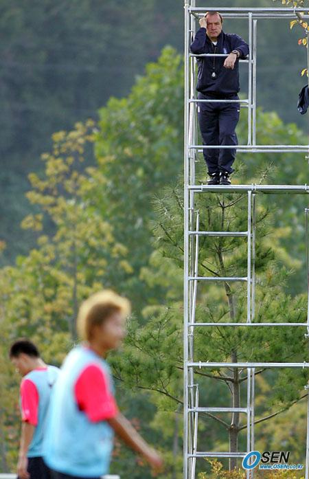 아드보카트 신임 감독이 이끄는 한국 축구대표팀이 소집 이틀째인 8일 오전에 이어 오후에도 훈련을 소화했다. 오후 훈련서 아드보카트 감독이 코칭스태프용 간이 철제 망루에 올라 연습경기를 내려다 보고 있다./파주=주지영 기자 jj0jj0@osen.co.kr [Copyright ⓒ OSEN(www.osen.co.kr) 무단전재 및 재배포 금지]
