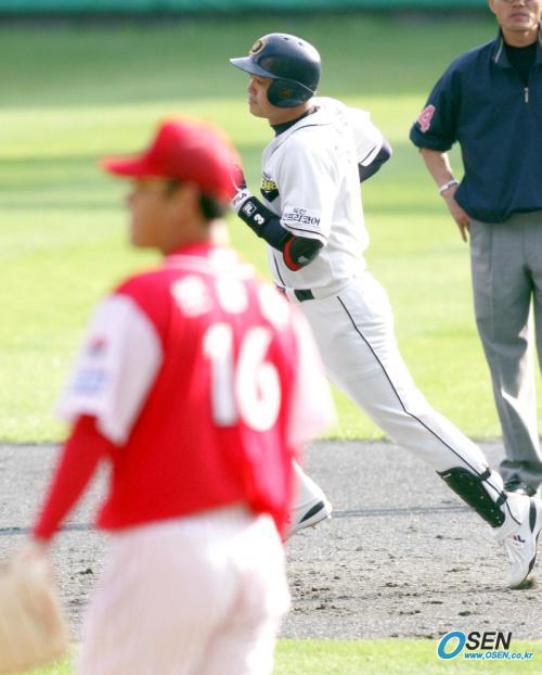 9일 잠실구장에서 벌어진 두산 베어스와 한화 이글스의 PO 2차전 두산의 5회말 2사 2루서 안경현이 좌측 펜스를 넘어가는 투런홈런을 날린 뒤 2루를 돌고 있다. 홈런을 맞은 한화 선발투수 문동환이 아쉬운 마음으로 관중석을 바라보고 있다./잠실=손용호 기자 spjj@osen.co.kr [Copyright ⓒ OSEN(www.osen.co.kr) 무단전재 및 재배포 금지]