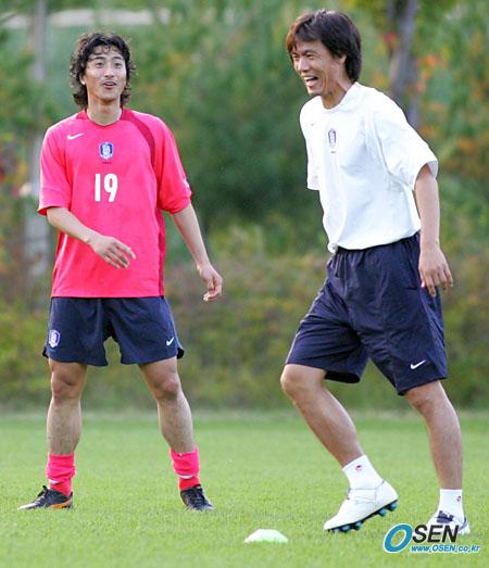 훈련 후 '게임'을 벌이는 홍명보 코치와 안정환