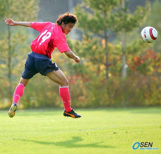 아드보카트 신임 감독이 이끄는 대표팀이 10일 오후 파주 NFC 트레이닝 센터에서 소집 4일째 훈련을 실시했다. 안정환이 좌우 크로스에 이은 슈팅 연습서 멋진 헤딩슛을 날리고 있다./파주=주지영 기자 jj0jj0@osen.co.kr [Copyright ⓒ OSEN(www.osen.co.kr) 무단전재 및 재배포 금지]