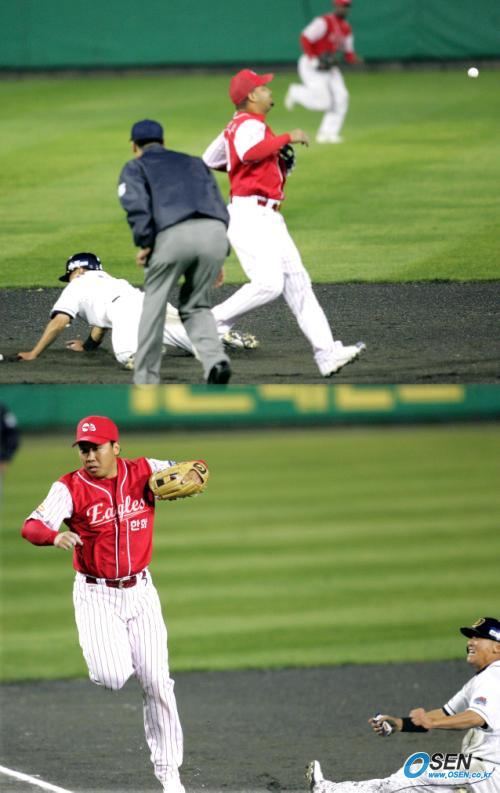10일 잠실구장에서 벌어진 두산 베어스와 한화 이글스의 PO 3차전 두산의 5회말 2사 1루서 1루주자 전상렬의 2루 도루 때 포수 신경현의 악송구(위 사진)에 이어 이를 잡은 중견수 데이비스의 3루 악송구가 잇달아 (아래 사진) 전상렬이 홈까지 들어오며 선취점을 올렸다./잠실=손용호 기자 spjj@oseh.co.kr [Copyright ⓒ OSEN(www.osen.co.kr) 무단전재 및 재배포 금지]