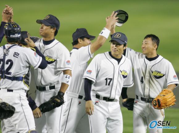 10일 잠실야구장에서 벌어진 두산 베어스와 한화 이글스의 PO 3차전서 두산이 1-0으로 신승, 시리즈 전적 3-0의 완승을 거두며 한국시리즈에 진출했다. 경기가 끝난 뒤 MVP로 선정된 전상렬(오른쪽) 등 선수들이 마운드에 모여 하이파이브를 나누고 있다./잠실=손용호 기자 spjj@osen.co.kr [Copyright ⓒ OSEN(www.osen.co.kr) 무단전재 및 재배포 금지]
