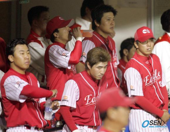 10일 잠실구장에서 벌어진 두산 베어스와 한화 이글스의 PO 3차전서 두산이 1-0으로 승리, 시리즈 전적 3-0의 완승을 거두며 한국시리즈에 진출했다. 9회초 2사 후 주자 없는 상황에서 덕아웃의 한화 선수들이 착잡한 표정으로 경기를 지켜보고 있다./잠실=손용호 기자 spjj@osen.co.kr [Copyright ⓒ OSEN(www.osen.co.kr) 무단전재 및 재배포 금지]