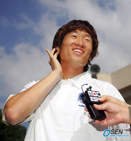 11일 오전 서울 홍은동 그랜드 힐튼 호텔에서 축구 대표선수 전원이 합동 기자 간담회를 가졌다. 박지성이 방송사와 인터뷰하며 말하기 쑥쓰러운 듯한 표정을 짓고 있다./주지영 기자 jj0jj0@osen.co.kr [Copyright ⓒ OSEN(www.osen.co.kr) 무단전재 및 재배포 금지]