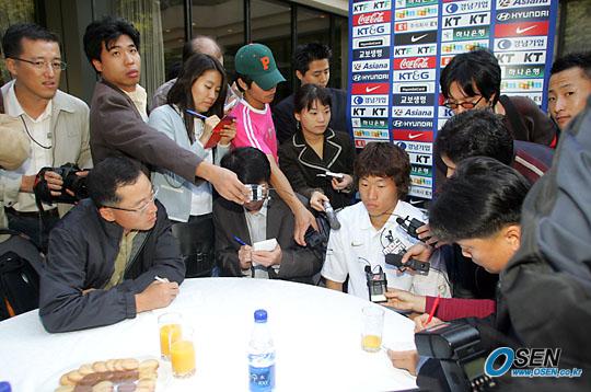 11일 오전 서울 홍은동 그랜드 힐튼 호텔에서 축구 대표선수 전원이 합동 기자 간담회를 가졌다. 박지성에게 유난히 많은 취재진이 몰려 인터뷰하고 있다./주지영 기자 jj0jj0@osen.co.kr [Copyright ⓒ OSEN(www.osen.co.kr) 무단전재 및 재배포 금지]