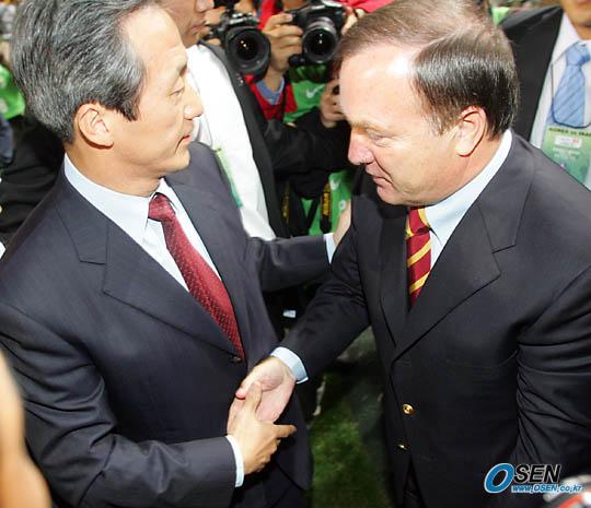 12일 저녁 서울 상암 월드컵경기장에서 벌어진 이란과의 평가전으로 한국대표팀 데뷔전을 치른 아드보카트 감독(오른쪽)이 경기에 앞서 정몽준 대한축구협회장과 악수를 나누고 있다./상암=주지영 기자 jj0jj0@osen.co.kr [Copyright ⓒ OSEN(www.osen.co.kr) 무단전재 및 재배포 금지]