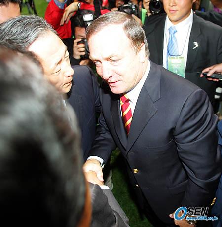 12일 저녁 서울 상암 월드컵경기장에서 벌어진 이란과의 평가전으로 한국대표팀 데뷔전을 치른 아드보카트 감독(오른쪽)에게 정몽준 대한축구협회장이 경기에 앞서 격려하고 있다./상암=주지영 기자 jj0jj0@osen.co.kr [Copyright ⓒ OSEN(www.osen.co.kr) 무단전재 및 재배포 금지]