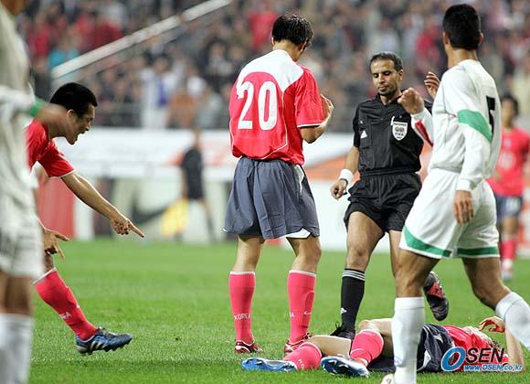 12일 저녁 서울 상암 월드컵경기장서 벌어진 아드보카트 신임 감독의 데뷔전서 한국이 조원희와 김진규의 골로 이란에 2-0으로 승리했다. 전반 이란 문전에서 박지성이 파울을 당하자 조원희가 페널티 박스 안에서 파울이 발생했다며 라인을 가리키고 있다./상암=손용호 기자 spjj@osen.co.kr [Copyright ⓒ OSEN(www.osen.co.kr) 무단전재 및 재배포 금지]