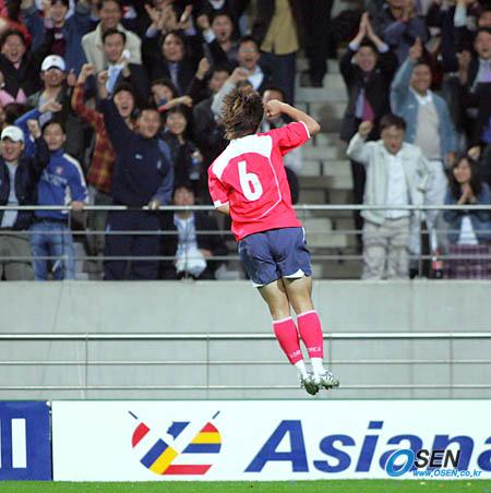 12일 저녁 서울 상암 월드컵경기장서 벌어진 아드보카트 신임 감독의 데뷔전서 한국이 조원희와 김진규의 골로 이란에 2-0으로 승리했다. 김진규가 2번째 골을 성공시킨뒤 관중석을 향해 점프하며 주먹을 높이 들고 기뻐하자 관중들도 다함께 같은 포즈로 호응하고 있다. /상암=주지영 기자 jj0jj0@osen.co.kr [Copyright ⓒ OSEN(www.osen.co.kr) 무단전재 및 재배포 금지]